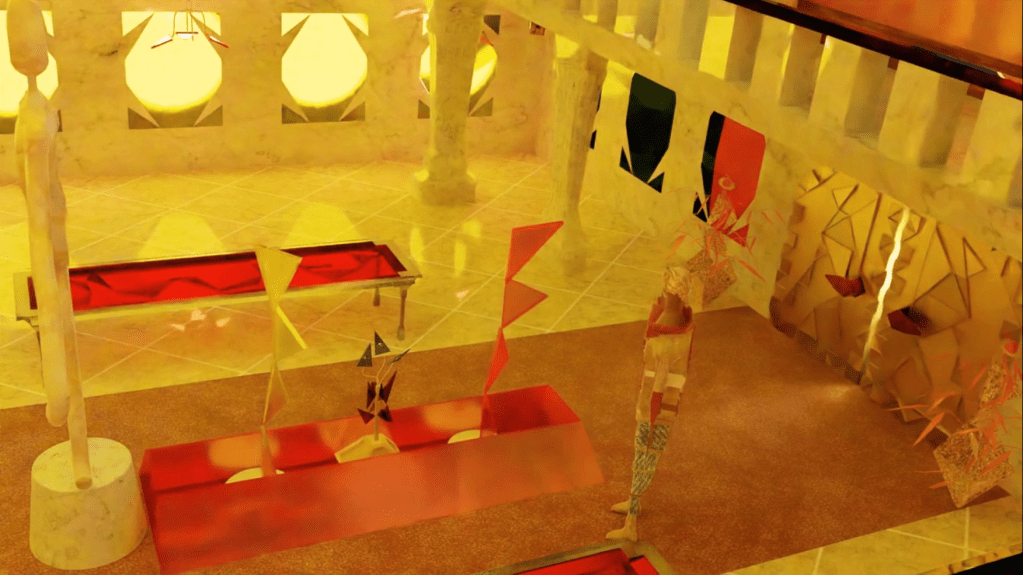 A video of a character entering a fancy room very ornate design in it’s architecture and also a focus on marble and bright lights.